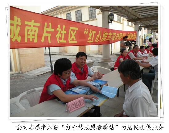 活动当天,加入“红心结志愿者驿站”的公司志愿者为社区居民提供了设摊服务,集中接受居民咨询和建议,为即将到来的“七一”节献上贺礼。
