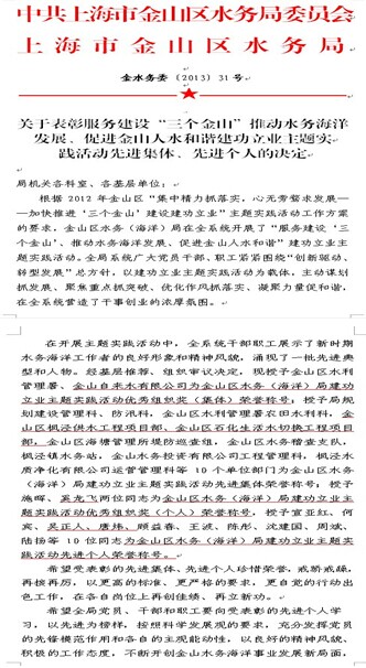 近日,上海金山自来水有限公司及经理奚龙飞、枫泾供水工程项目部、金山石化生活水切换项目部、副经理吴正人、唐炜、分别被授予“金山区水务(海洋)局服务建设‘三个金山’、推进水务海洋发展、促进金山人水和谐建功立业主题实践活动”优秀组织奖、先进集体、先进个人的荣誉称号。