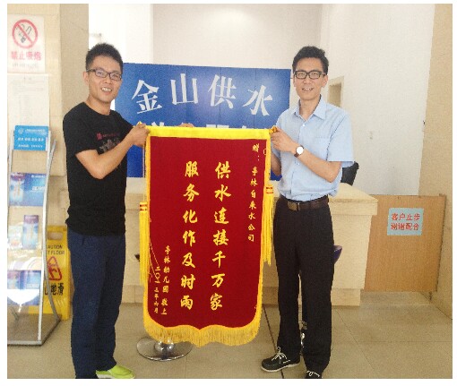 亭林幼儿园对亭林分公司的及时服务和真诚帮助给予了高度的肯定,近日园方代表送来了题为“供水连接千万家,服务化作及时雨”的锦旗,以对分公司长期以来做出的便民服务表示由衷的感谢。