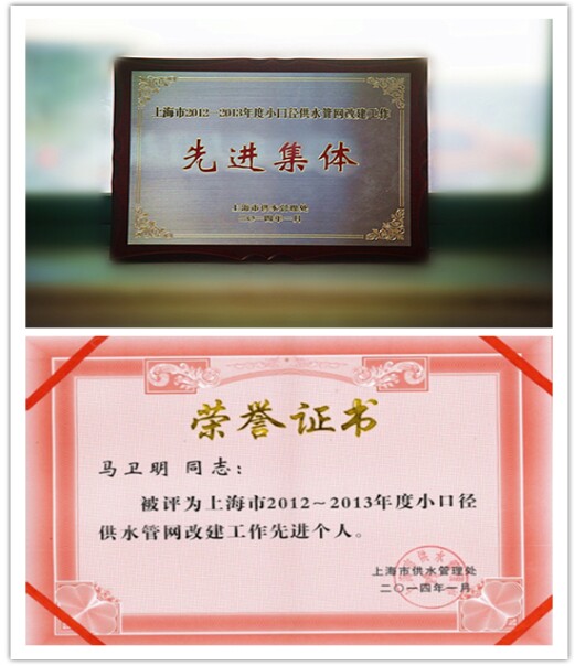 近日,在上海市小口径供水管网改建工作总结与表彰会上,公司被授予2012~2013年度上海市小口径供水管网改建工作先进集体。公司经理马卫明荣获“2012~2013年度上海市小口径供水管网改建工作先进个人”荣誉称号。