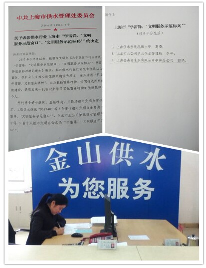 近日,由上海市文明办组织开展评选的“双百”文明服务示范窗口和标兵活动揭晓,上海金山自来水有限公司郭艳同志喜获“学雷锋,文明服务示范标兵”称号。