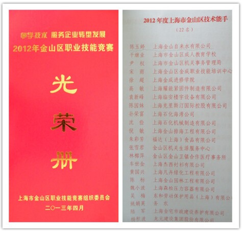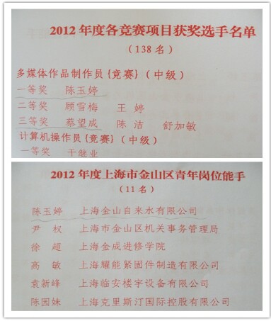 在2012年金山区“争学技术、服务企业转型发展”职业技能竞赛活动中,我司多名职工取得了优异成绩,来自公司办公室的陈玉婷、蔡望成同志分别荣获多媒体制作员竞赛活动一等奖和三等奖,陈玉婷同志被授予2012年度金山区技术能手、区青年岗位能手荣誉称号。