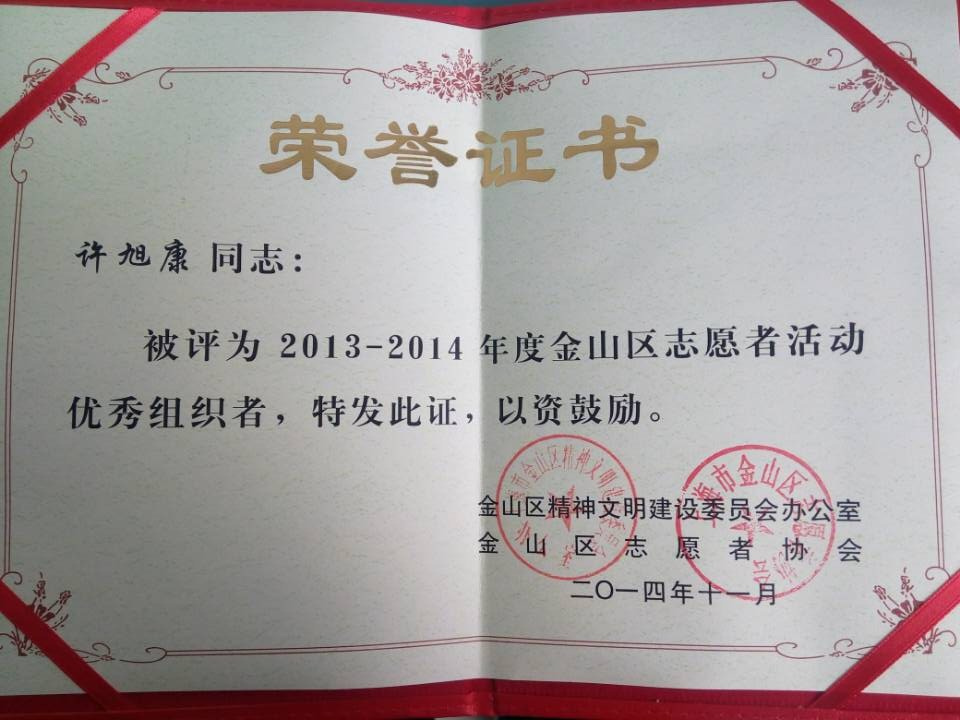 近期,许旭康同志被评为“2013-2014年度金山区志愿者活动优秀组织者”。