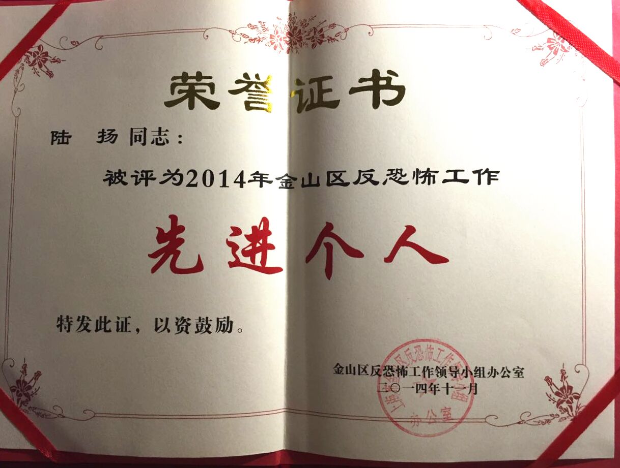 陆扬同志获2014年金山区反恐怖工作先进个人