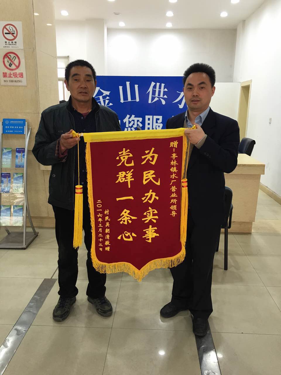 近日,亭林镇亭北村7组居民吴先生激动地将一面写有“为民办实事 党群一条心”的锦旗送到金山自来水公司亭林营业厅,专程感谢党员干部曹兵锋为他解困办实事。