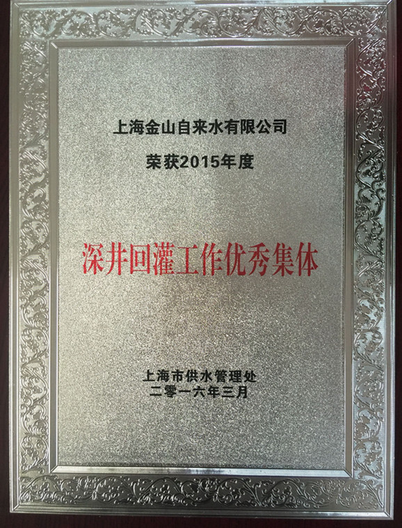 近日,在上海供水行业2015年取水管理和深井回灌工作会议上,金山自来水公司被上海市供水管理处授予“2015年度深井回灌工作优秀集体”称号。