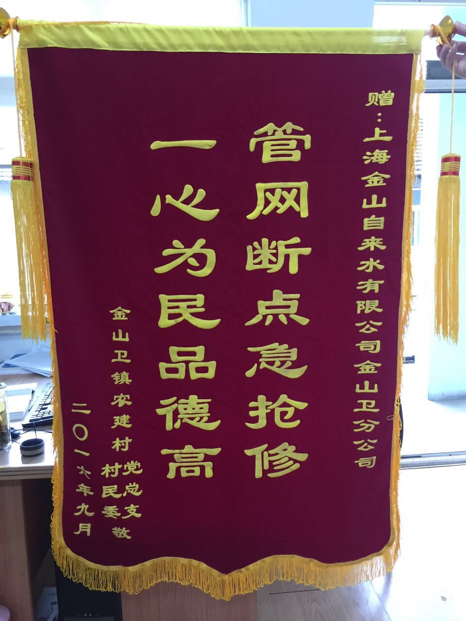 近日,金山卫镇农建村向金山自来水公司金山卫分公司送来了一面“管网断点急抢修 一心为民品德高”的锦旗,对分公司积极配合拆违行动,保障村民用水环境表示衷心感谢。