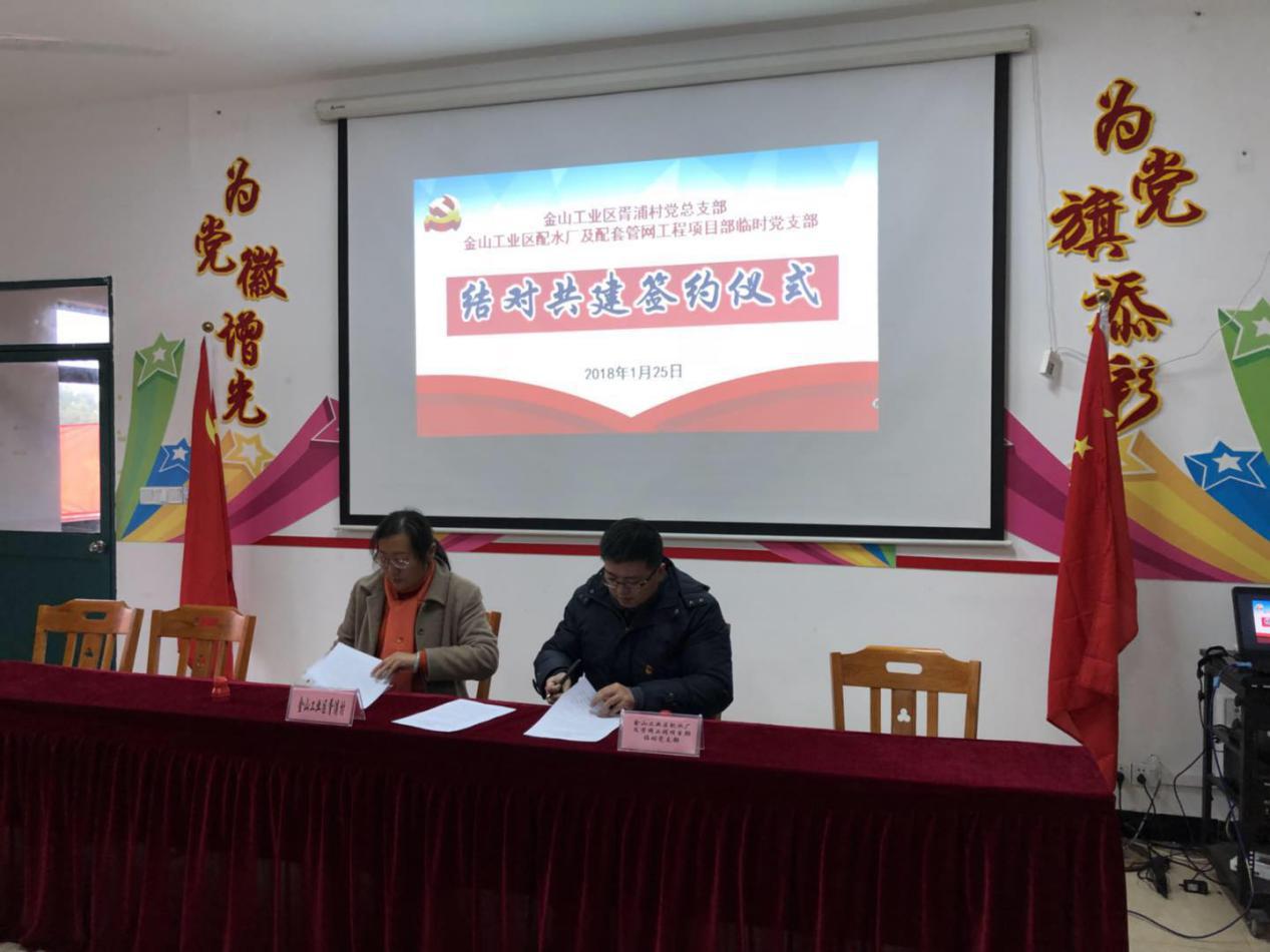 为贯彻落实十九大精神,推进“两学一做”学习教育常态化制度化建设,实现支部资源共享、优势互补的党建新格局,1月25日下午,金山工业区配水厂及配套管网工程项目部临时党支部与金山工业区胥浦村党总支进行了基层支部结队共建签约仪式。