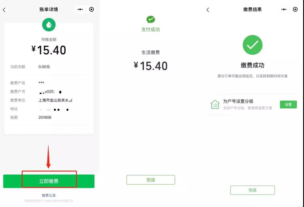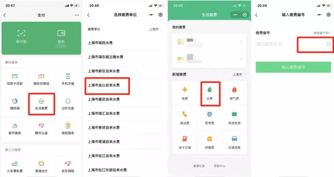打开微信“生活缴费”→选择“水费”→选择“上海市金山自来水费”→点击“缴费编号”→扫描水费账单上的条形码/手动输入户号→立即缴费