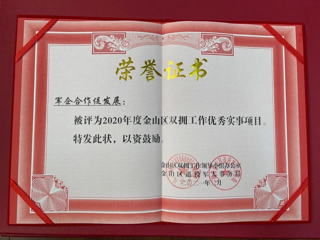 ▲公司“军企合作促发展”被评为2020年度金山区双拥工作优秀实事项目。