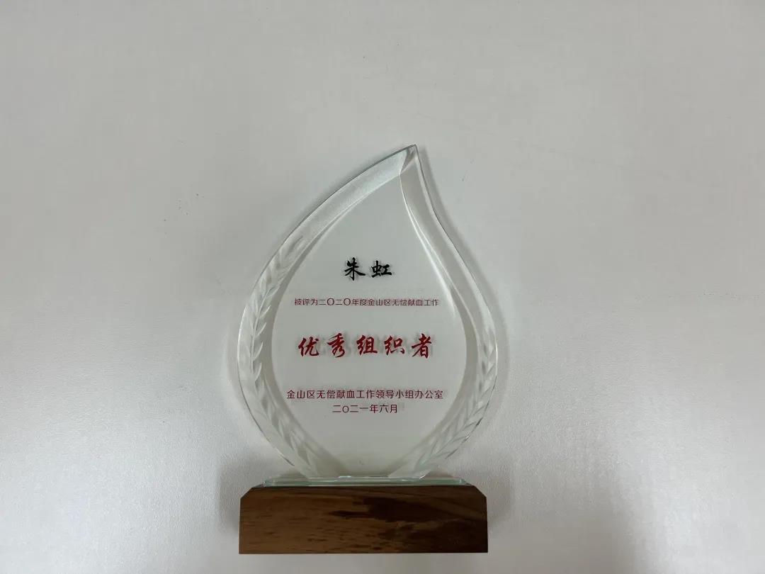 ▲公司党总支副书记、工会主席朱虹荣获2020年度金山区无偿献血工作优秀组织者称号。