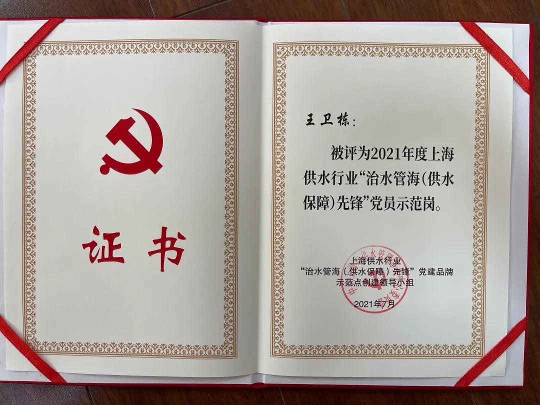 ▲公司王卫栋同志被评为2021年度上海供水行业“治水管海(供水保障)先锋”党员示范岗。