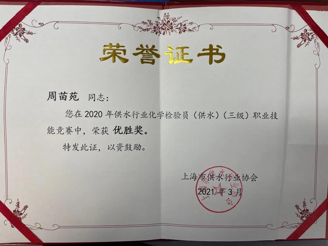 ▲公司周苗苑同志在2020年供水行业化学检验员(供水)(三级)职业技能竞赛中,荣获优胜奖。