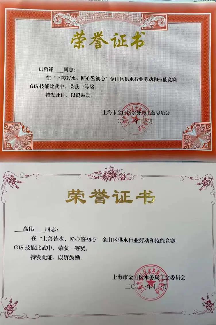 ▲公司高伟、洪哲锋同志荣获“上善若水,匠心鉴初心”金山区供水行业劳动和技能竞赛GIS技能比武一等奖。