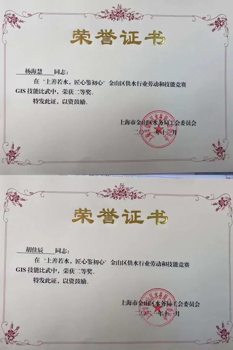 ▲公司杨海慧、胡佳辰同志荣获“上善若水,匠心鉴初心”金山区供水行业劳动和技能竞赛GIS技能比武二等奖。
