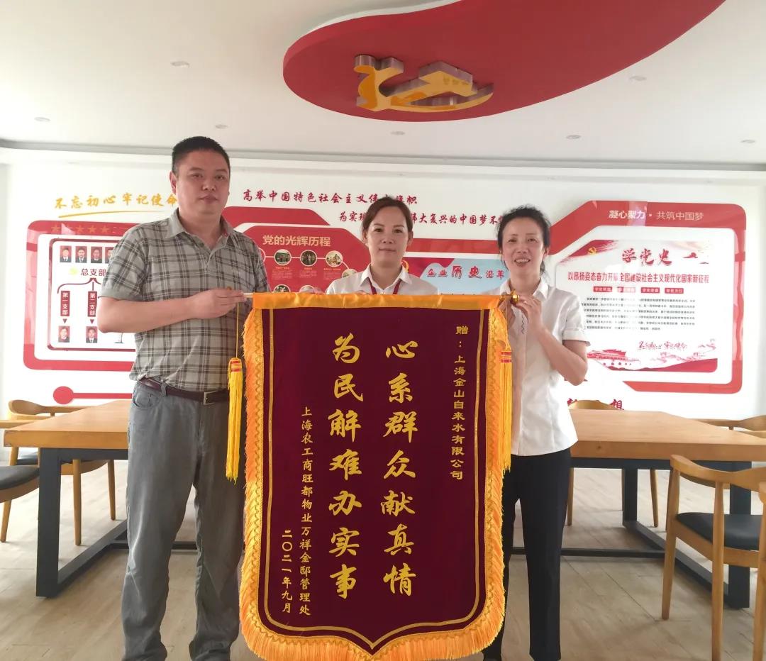 9月6日,公司收到上海农工商旺都物业万祥金邸管理处“心系群众献真情 为民解难办实事”锦旗,物业负责人对金山自来水公司时刻心系人民群众、主动承担社会责任的精神连连称赞。