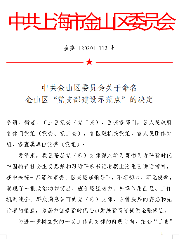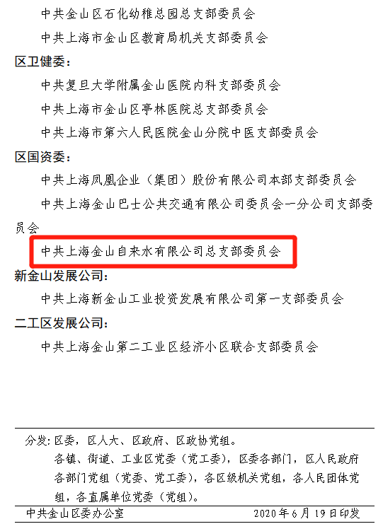 近日,区委下发文件,我司党总支被命名为金山区“党支部建设示范点”。这是继公司党总支荣获金山国资系统五星党支部后又一殊荣。近年来,金山自来水公司作为公共服务类国有企业,始终发挥党建引领作用,以党建独特优势为国有企业改革发展强根铸魂。通过深入开展“两学一做”主题教育、“不忘初心、牢记使命”主题教育、“四史”学习教育,更好发挥基层党组织战斗堡垒作用,为供水服务保障提供强有力的思想保障。