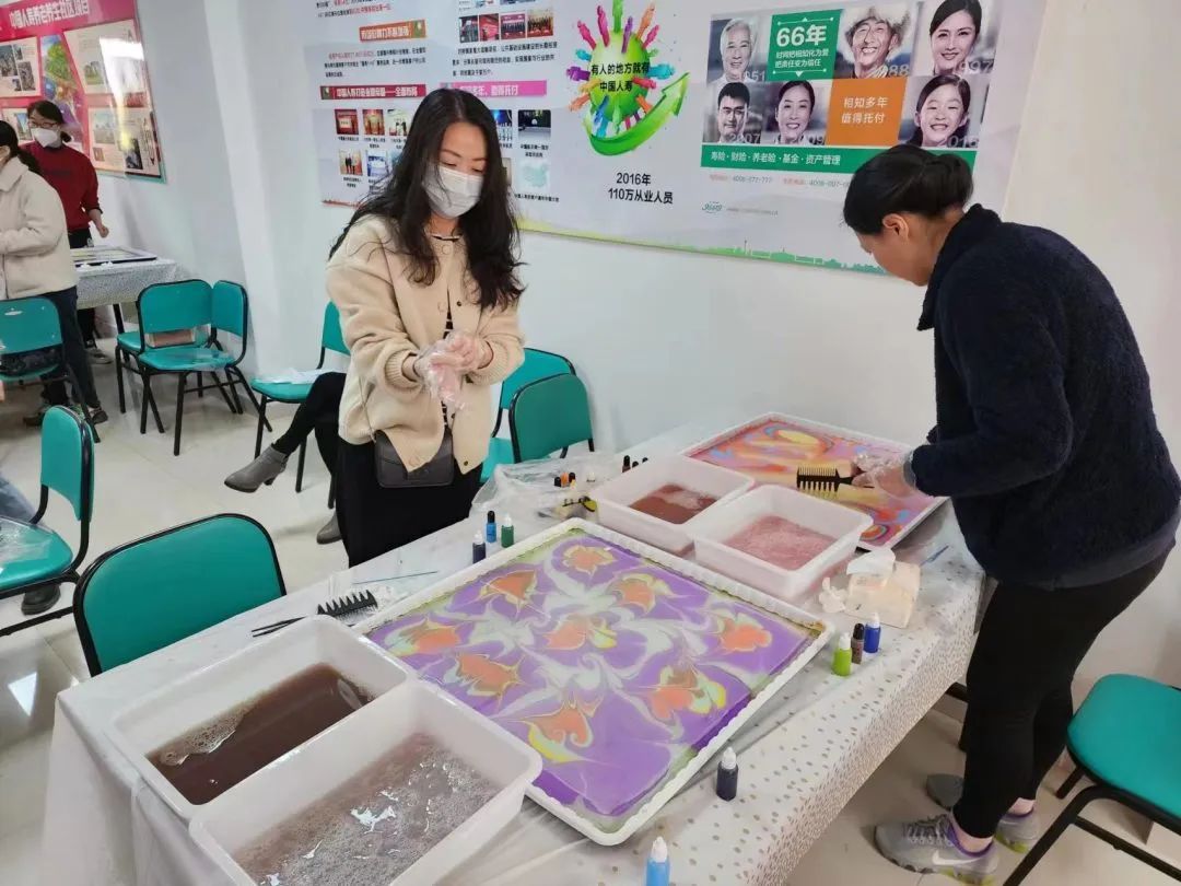 3月7日上午,工会开展了制作水拓丝巾的非遗体验课,女职工们在老师的讲解下,积极发挥想象力,从调色、创作、水拓、固色到晾干,大家认真专注地亲手制作有着美丽色彩的丝巾,体验着颜色与水的碰撞交融。