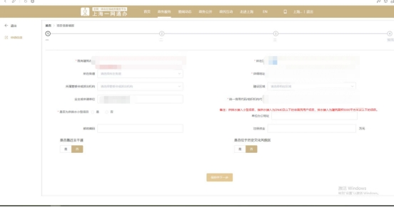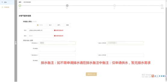 6、填写水电气基本信息,勾选“供排水”,供水选择“上海金山自来水有限公司”,排水选择“上海市金山区排水所”,并填写经办人。注:由于供排水为联合申请需将供水和排水一起填写信息,经与排水所协商,如建设单位不需要申请排水,请在排水备注中填写:仅申请供水,暂无排水需求。填写完成后点击“保存并下一步”。