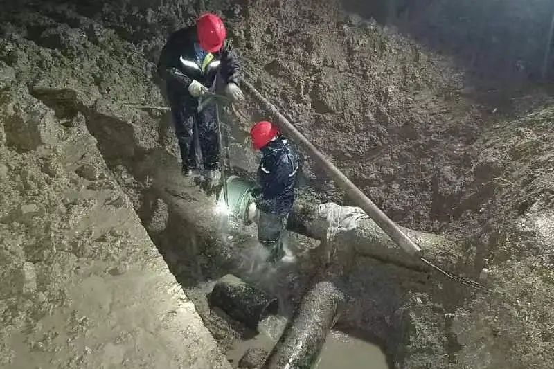 为了保障周边60户企业的生产用水,公司第一时间启动应急预案,负责人赶赴现场指挥协调,紧急调集维修队伍和机械设备,现场研究分析周边区域管网图,找准阀门方位,制定应急供水抢修方案。工作人员不畏寒潮,克服又湿又冷的不利天气条件,冒雨连夜作战。