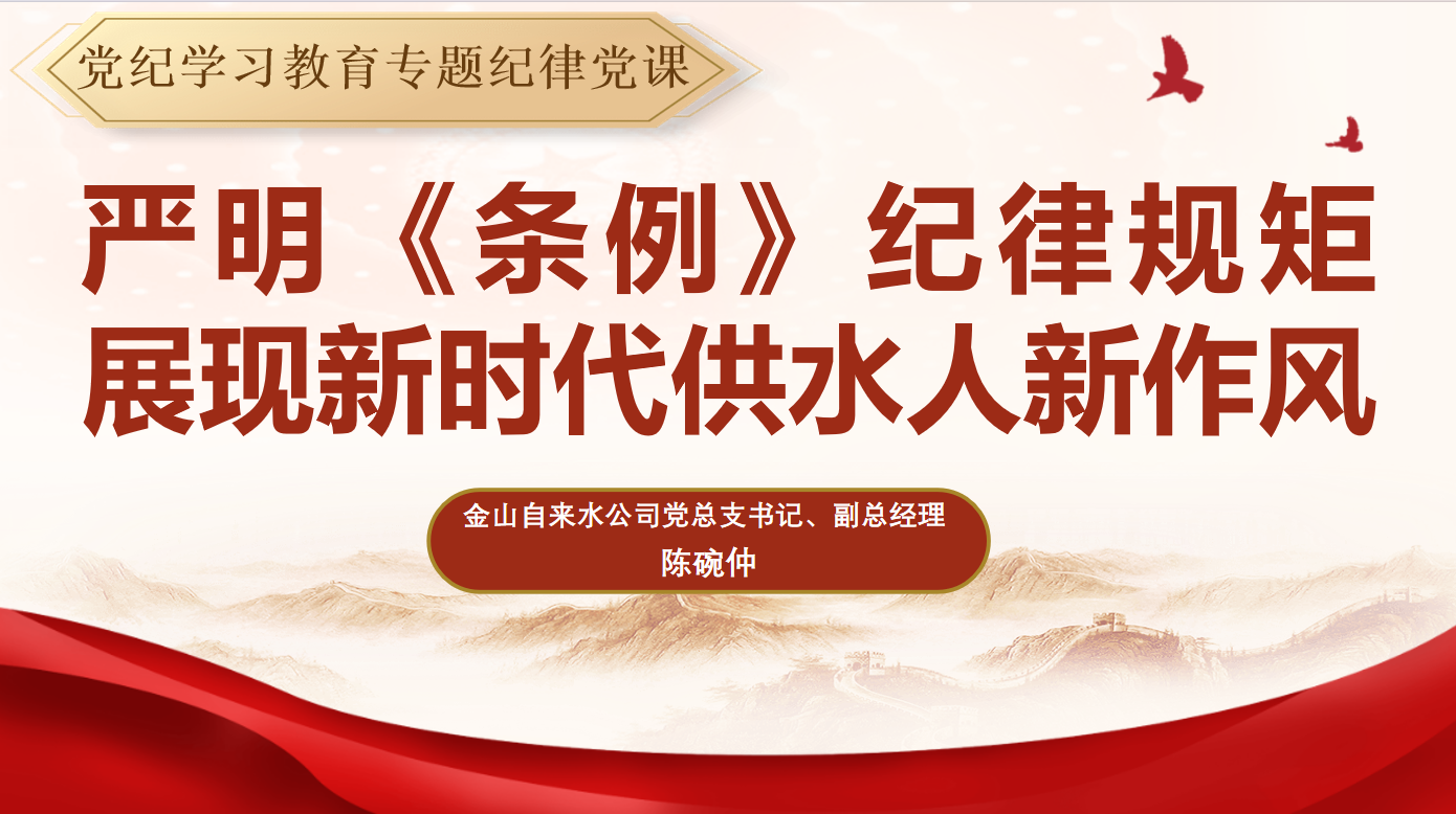 为进一步加强党纪学习教育,推动纪律作风建设,5月16日下午,公司党总支书记、副总经理陈碗仲以“严明《条例》纪律规矩 展现新时代供水人新作风”为主题为全体党员上了一堂专题纪律党课。