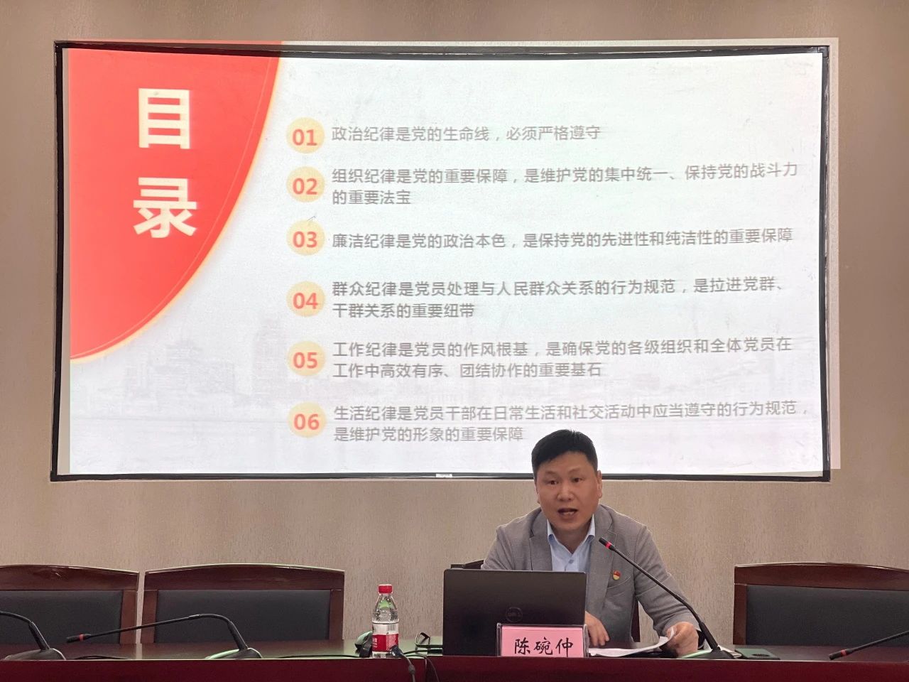 陈碗仲围绕新修订的《中国共产党纪律处分条例》,聚焦“六项纪律”的重点内容,从“政治纪律是党的生命线,必须严格遵守”、“组织纪律是党的重要保障,是维护党的集中统一、保持党的战斗力的重要法宝”、“廉洁纪律是党的政治本色,是保持党的先进性和纯洁性的重要保障”、“群众纪律是党员处理与人民群众关系的行为规范,是拉进党群、干群关系的重要纽带”、“工作纪律是党员的作风根基,是确保党的各级组织和全体党员在工作中高效有序、团结协作的重要基石”、“生活纪律是党员干部在日常生活和社交活动中应当遵守的行为规范,是维护党的形象的重要保障”等六个方面与党员们深入探讨了新时代供水人必须严格遵守六项纪律的重要意义。