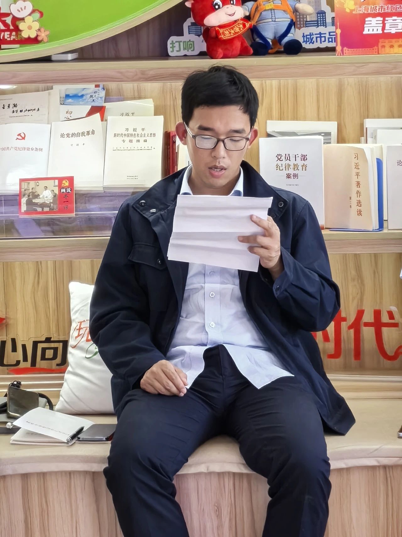 最后,全体党员来到初心馆一楼的“初心书屋”,书架上摆满了记载着李一谔事迹的书籍、党史、地方志,党员代表彭文杰领学《中国共产党纪律处分条例》第一章至第四章,党员代表邬晨玮分享党纪学习教育心得体会,党员们结合自身工作内容对党纪学习情况进行了热烈的讨论和交流。