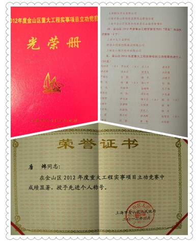 公司三名同志被授予“金山区2012年度重大工程实事项目立功竞赛先进个人”荣誉称号