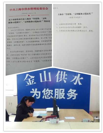 近日,由上海市文明办组织开展评选的“双百”文明服务示范窗口和标兵活动揭晓,上海金山自来水有限公司郭艳同志喜获“学雷锋,文明服务示范标兵”称号。