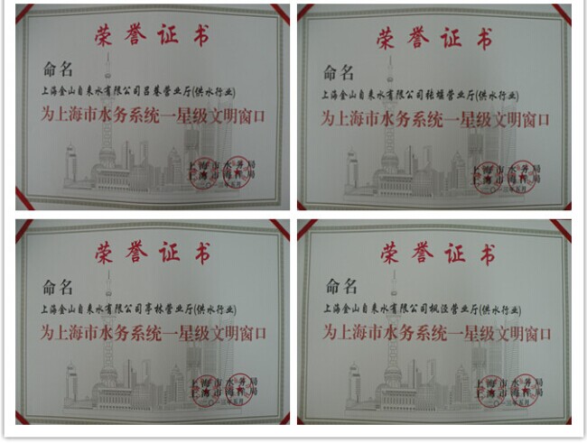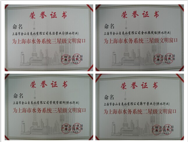 经上海市供水行业精神文明建设领导小组对公司多个服务窗口的检查和评定,张堰营业厅、亭林营业厅、枫泾营业厅和吕巷营业厅被市水务局(海洋局)命名为一星级文明窗口,廊下营业厅由一星级晋升为二星级文明窗口,管线管理所、朱泾营业厅和金水热线组由二星级晋升为三星级文明窗口。