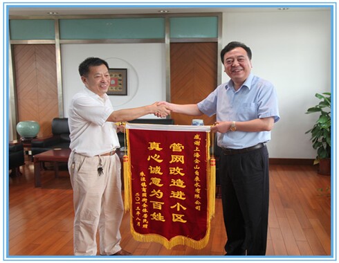 8月23日下午,来自朱泾镇商园街的居民代表满面笑容来到公司,送上了一面绣有“管网改造进小区,真心诚意为百姓”的锦旗,激动地表达了小区近200户受益居民对我司供水管网改造工作的感谢。