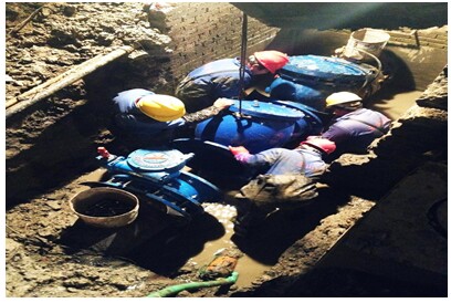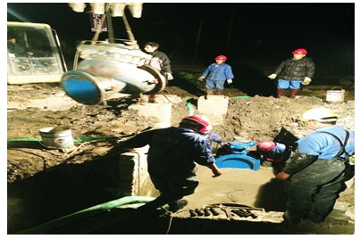 12月的冬夜,气温直逼零度冰点,户外施工现场更是寒气逼人,施工人员为了加快施工进度,缩短停水时间,坚持穿着下水衣浸泡在半人深冰冷的水中进行不间断的施工作业。