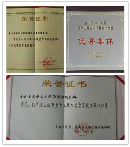 近日,枫泾供水工程项目部分别被授予2012年度上海市重大工程立功竞赛优秀集体以及金山区2012年度重大工程实事项目立功竞赛优秀集体的荣誉称号。