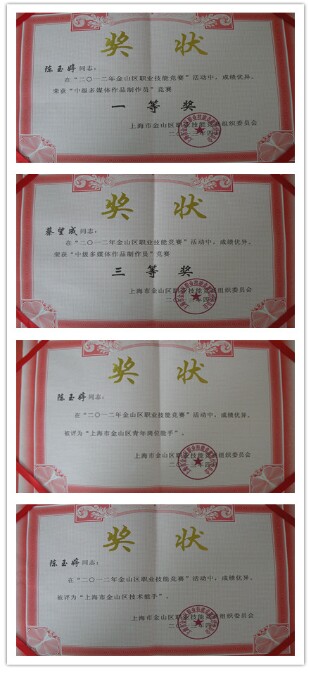 在2012年金山区“争学技术、服务企业转型发展”职业技能竞赛活动中,我司多名职工取得了优异成绩,来自公司办公室的陈玉婷、蔡望成同志分别荣获多媒体制作员竞赛活动一等奖和三等奖,陈玉婷同志被授予2012年度金山区技术能手、区青年岗位能手荣誉称号。
