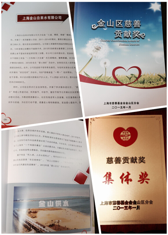 上海金山自来水有限公司作为公共服务型企业,在不断致力于提高安全供水保障的基础上,始终坚持面向社会,承担责任,积极开展及投身红十字人道救助、爱心奉献、社会服务等各类公益行动,大力弘扬“人道、博爱、奉献”精神,播撒大爱情怀,近年来,开展了一系列爱心传递活动。为服务建设“三个金山”,构建和谐社会作出了积极贡献,受到了社会的广泛认可和好评。近日,获得了金山区“慈善贡献奖”。