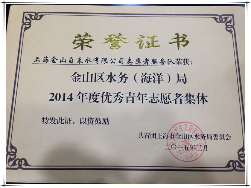 近日,公司青年志愿者服务队荣获区水务系统“2014年度优秀青年志愿者集体”,蔡望成、陈雯艳、陈玉婷和陈莉四名同志荣获区水务系统“2014年度优秀青年志愿者个人”荣誉称号。