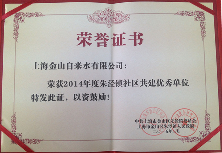 共存就有共责,共责就有共建,共建就有共赢。近日,金山自来水公司获得“2014年度朱泾镇社区共建优秀单位”荣誉称号。