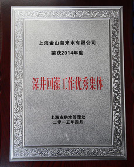 近日,上海金山自来水有限公司被上海市供水管理处授予“2014年度深井回灌工作优秀集体”称号。