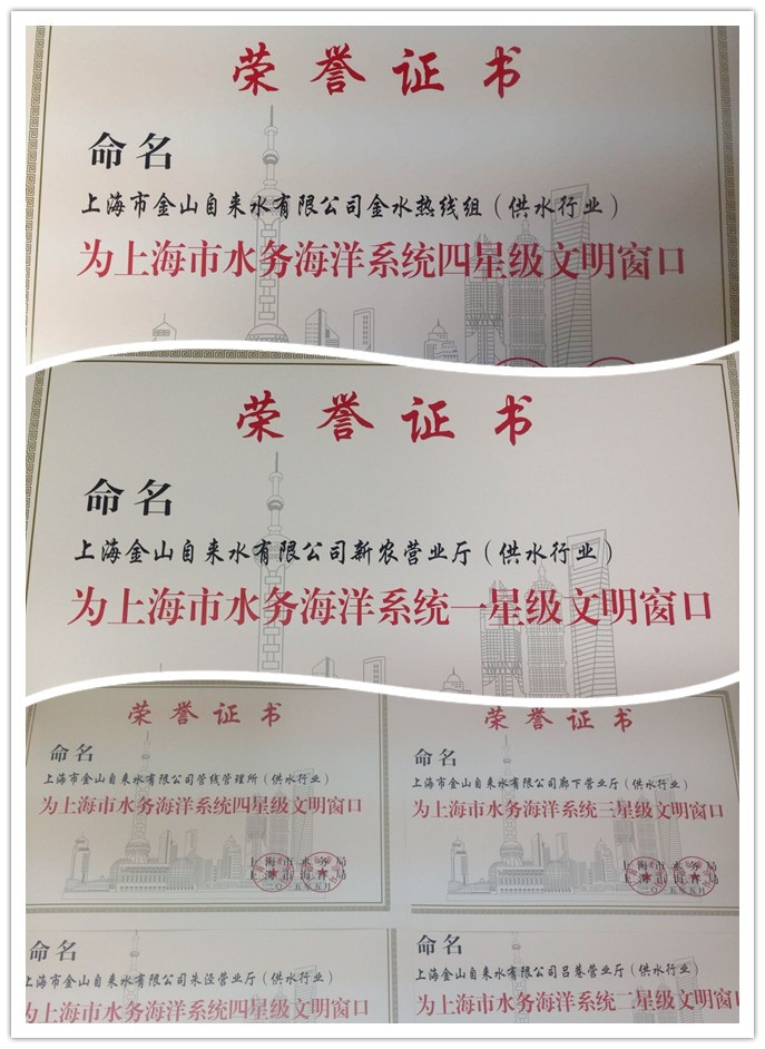 日前,上海金山自来水有限公司金水热线、管线管理所、分公司营业厅等13个窗口分别获得上海市水务行业颁发的2013-2014年度“四星级文明窗口”、“三星级文明窗口”、“二星级文明窗口”和“一星级文明窗口”荣誉称号。