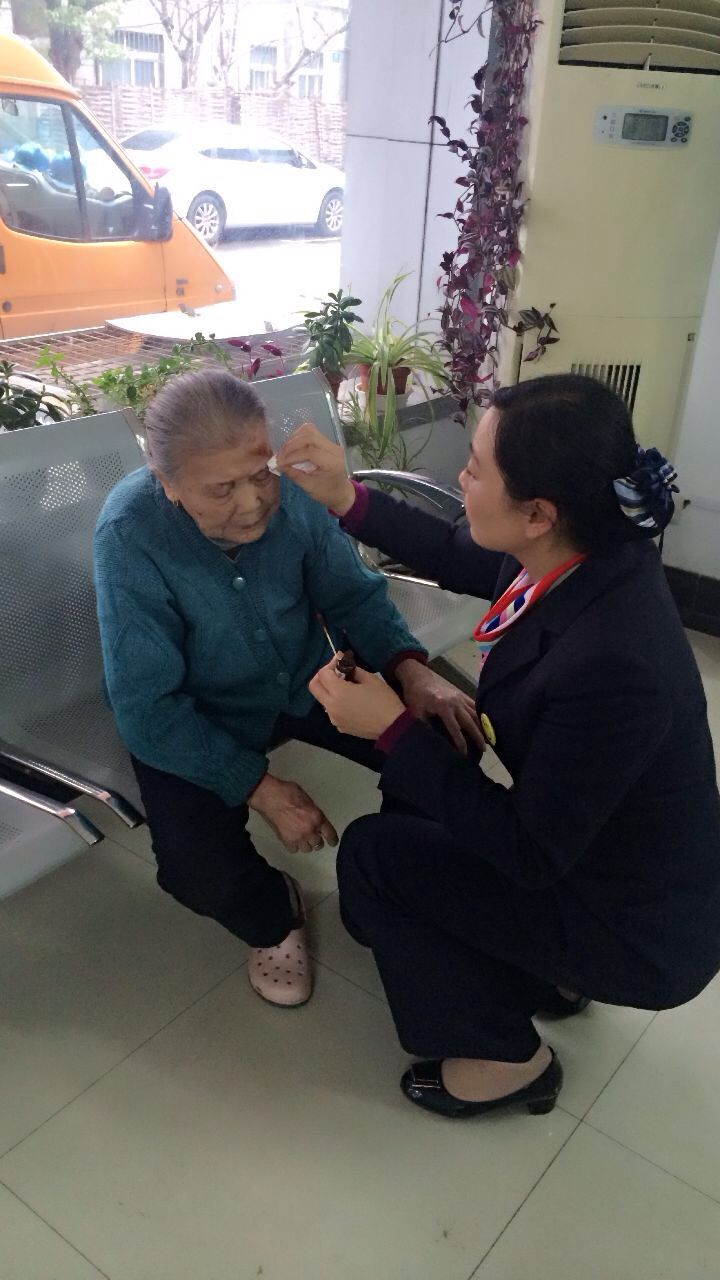 11月17日,金山自来水公司新农营业厅里出现了一幅温暖画面:工作人员身体半蹲,用棉棒细心地为老奶奶拭擦额角的伤口。