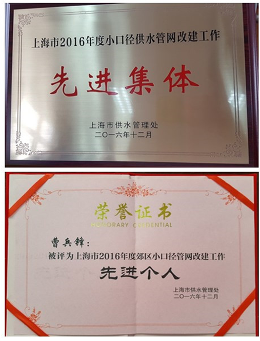 近日,在上海市小口径供水管网改建工作总结与表彰会上,公司被授予2016年度上海市小口径供水管网改建工作先进集体,亭林分公司经理曹兵锋荣获“2016年度上海市小口径供水管网改建工作先进个人”荣誉称号。
