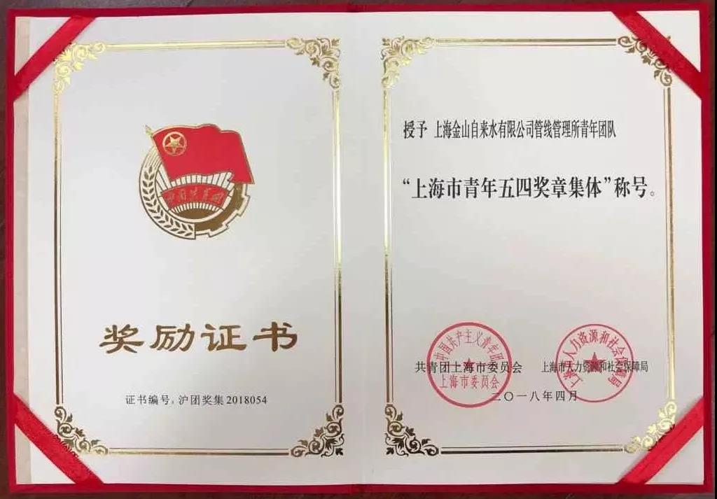 5月10日在区会议中心召开的共青团上海市金山区第七次代表大会开幕式上,上海金山自来水有限公司管线管理所被授予“上海市青年五四奖章集体”荣誉称号。