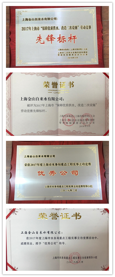 金山自来水公司在二次供水设施改造工作中表现突出,近日被授予“上海市五一劳动奖状”、2017年度上海市水务局重点工程实事立功竞赛先进集体以及“保障优质供水,改造二次设施”专项劳动竞赛先锋标杆荣誉称号。