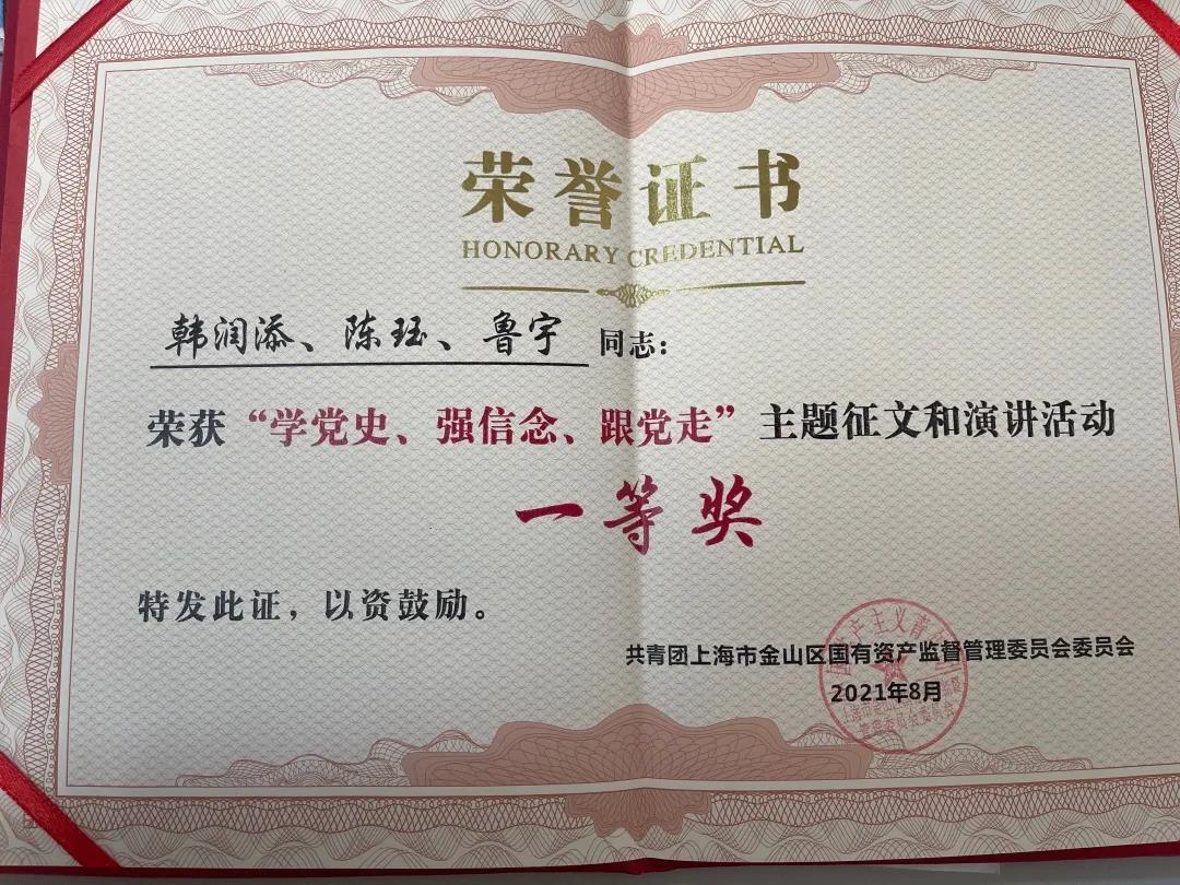 ▲公司荣获“学党史、强信念、跟党走”主题征文和演讲活动一等奖。