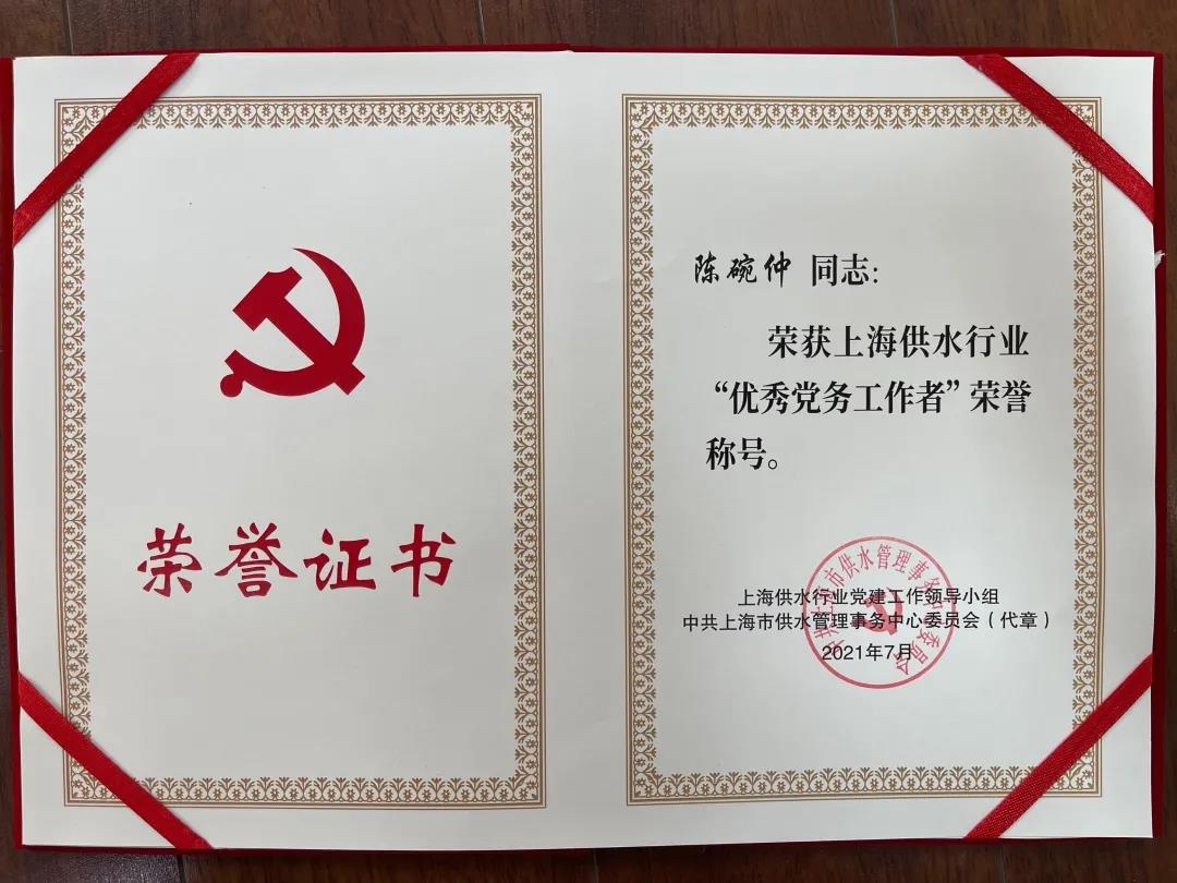 ▲公司党总支书记、副总经理陈碗仲荣获上海供水行业“优秀党务工作者”、金山区优秀共产党员称号。