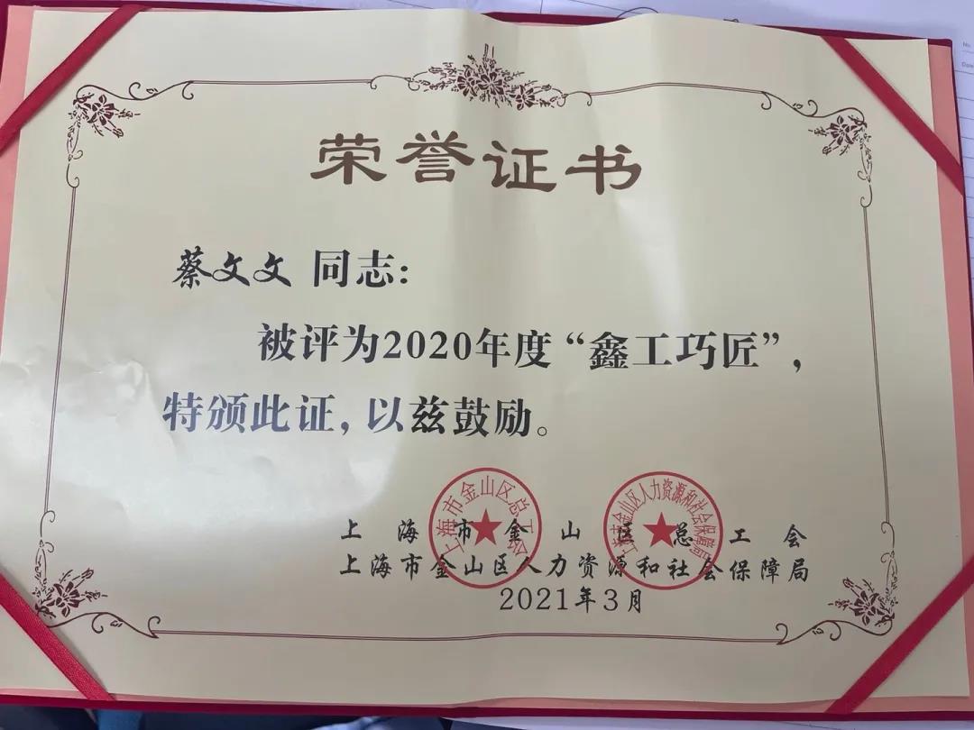 ▲公司蔡文文同志被评为2020年度“鑫工巧匠”荣誉称号。