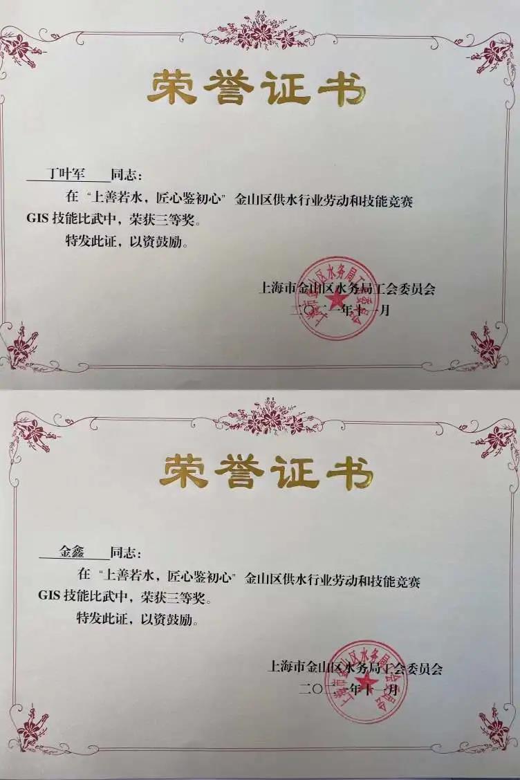 ▲公司杨海慧、胡佳辰同志荣获“上善若水,匠心鉴初心”金山区供水行业劳动和技能竞赛GIS技能比武二等奖。