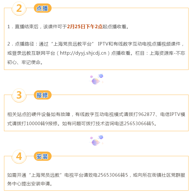为更好满足各基层党组织和广大党员群众学习收看需求,将于明天(2月25日)上午9点在“先锋上海”直播课堂播出(详见下方直播收看路径)。没有收看条件的党员群众可至附近的党群服务阵地收看,各区党建服务中心和街镇社区党群服务中心要做好收看的相关保障工作。