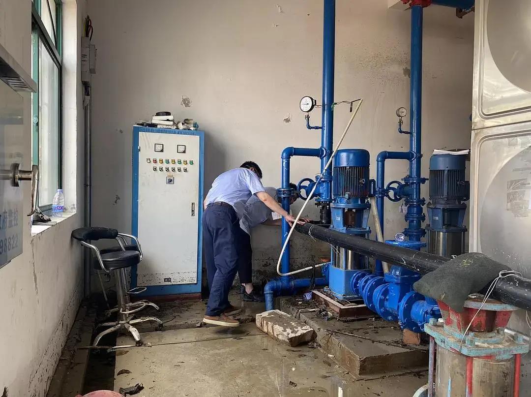 “烟花”台风期间,位于廊下镇景展家园因积水严重,导致小区二次供水泵站长时间浸泡在水中,不得不切断电源,居民处于停水又停电的困境中。在得知需要我司支援后,公司及时反应快速增援,党总支副书记、总经理马卫明与党总支委员、副总经理杨健亲自带队,第一时间赶赴现场组织应急抢修,在现场建立临时指挥部,制定科学抢修方案。由于原先泵站无法通电失去动力,抢险队伍通过增设110毫米口径的PE应急联通管,直接由地面直供,仅用3小时恢复小区580余户居民的正常供水。