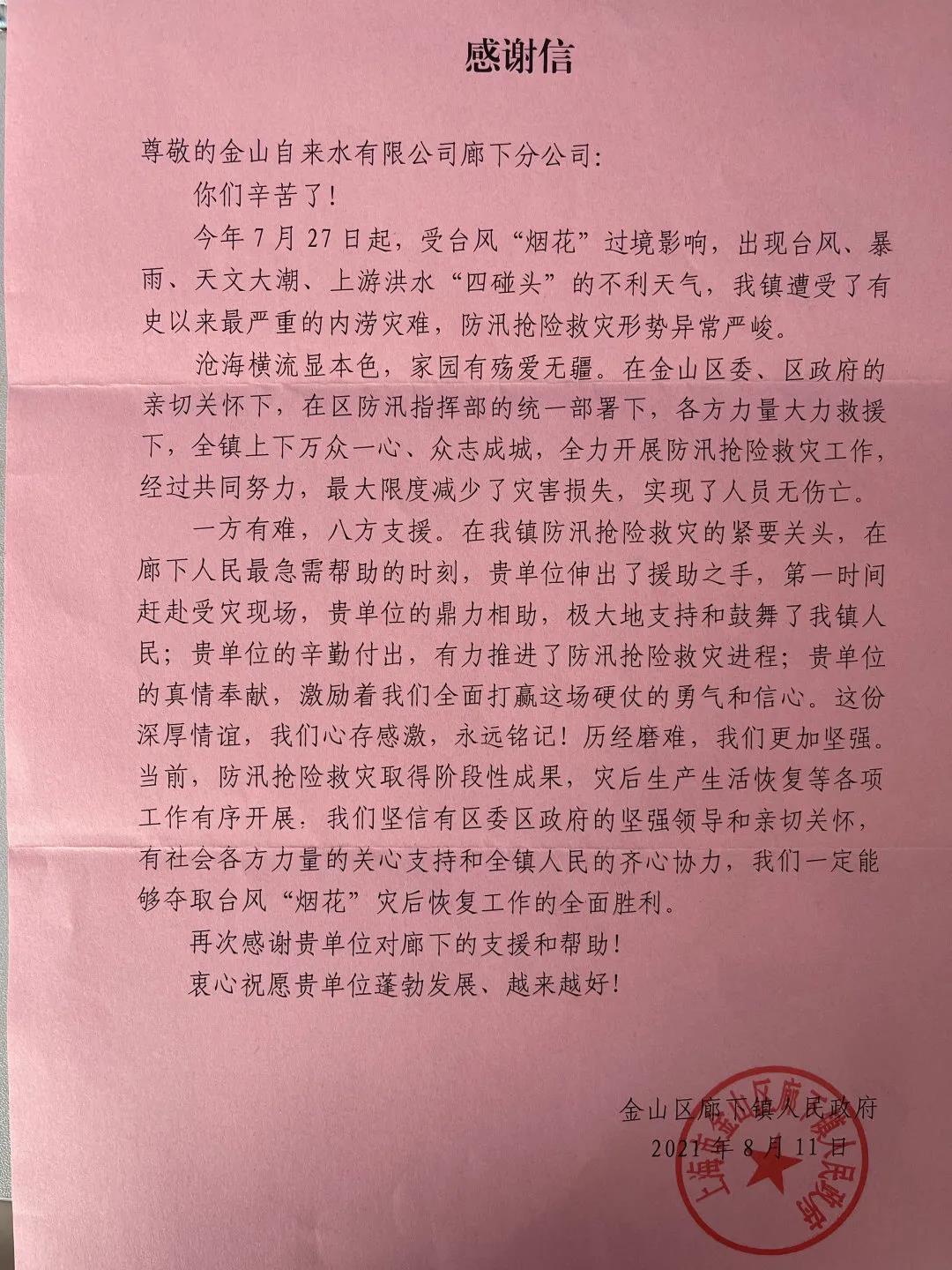 8月30日,公司收到金山区廊下镇人民政府的感谢信。信中提到:“一方有难,八方支援。在我镇防汛抢险救灾紧要关头,在廊下镇人民最急需帮助的时刻,贵单位伸出了援助之手,第一时间赶赴受灾现场,极大地支持和鼓舞了我镇人民,有力推进了防汛抢险救灾进程。这份深厚情谊,我们永远铭记。”
